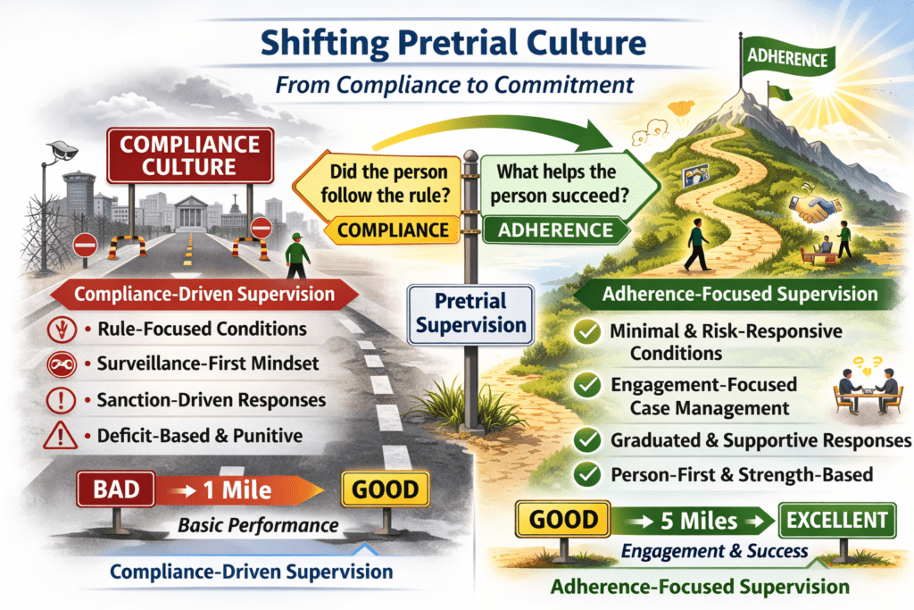Adherence culture asks a different question: What helps the person successfully complete pretrial supervision?